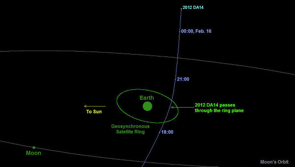 МОСКВА, 15 фев — РИА Новости. Астероид 2012 DA14, размером с 15-этажный дом, прошел высоту орбит геостационарных спутников и продолжает приближаться к Земле — он разминется с нашей планетой на расстоянии около 27,7 тысячи километров примерно в 23.30 мск.