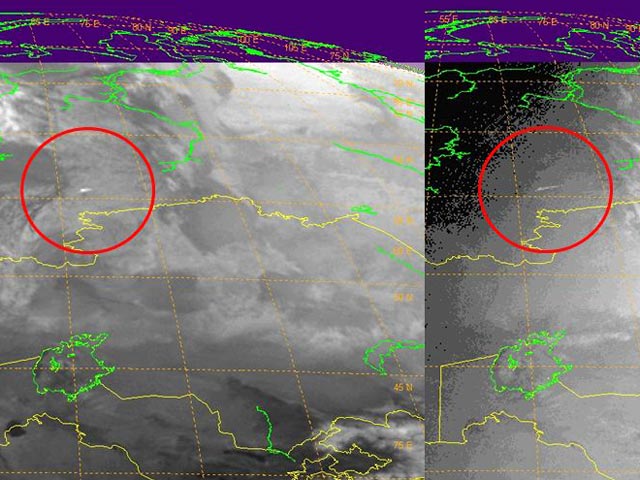 Европейская организация    спутниковой метеорологии опубликовала фотографию метеорита, упавшего 15 февраля    в Челябинской области.