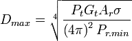— мощность передатчика; — коэффициент направленного действия антенны; — эффективная площадь антенны — эффективная площадь рассеяния цели — минимальная чувствительность приёмника.Минимальная мощность, при получении которой приемник может обнаружить отраженный от цели сигнал, задается формулой