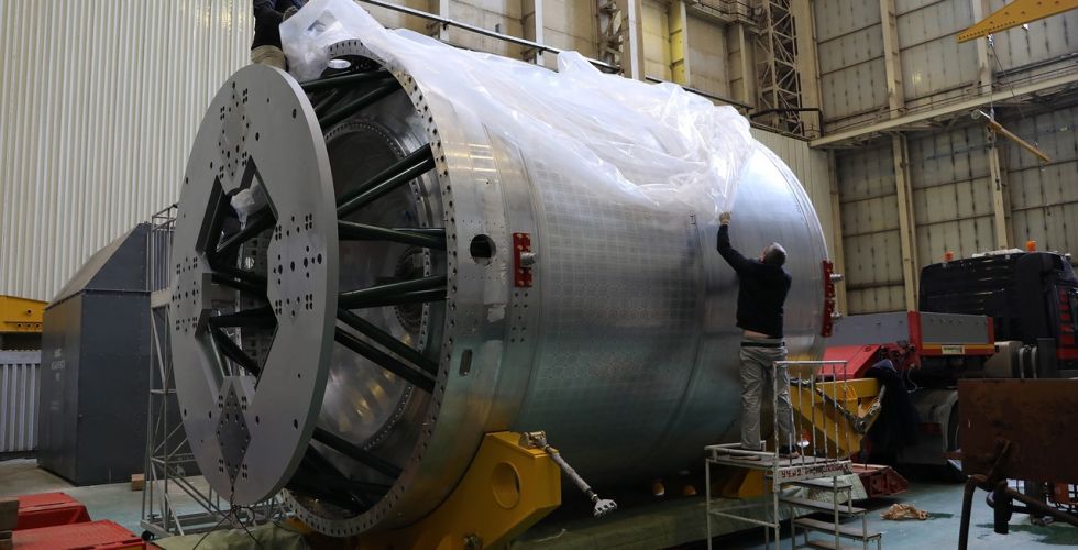 У Зенита бак Г1 длиной 9440мм. Из предыдущих сообщений инсайдера Туман Андромедов бак Г1 для С5 в месте стыка с хвостом 3900. Дальше конус 3900/4100. Если, как сказано, это ЭУ для испытания нагрузки от двигателя, то это 3900. На этой ЭУ нет деталей через которые  вес ракеты передаётся на опоры стола. Верхняя обечайка похоже не вафельная а с кольцевыми рёбрами. Итого: до целого бака и огня ещё далеко.