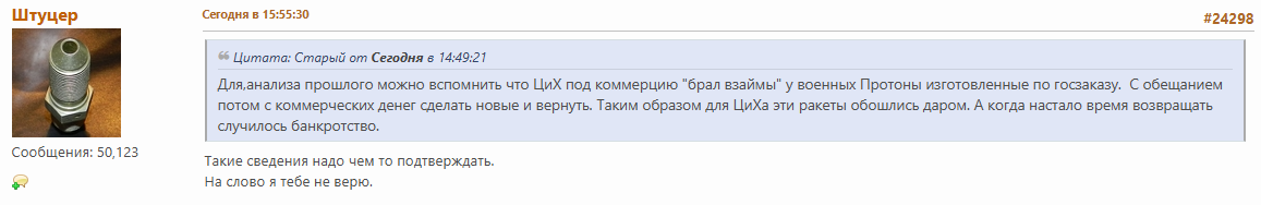 Для Протона вообще картина примерно следующая. Сначала от бесплатных готовых ракет и очень дешевого производства (накопленные запасы материалов, низкие зарплаты) огромная маржа даже от демпинговых цен вскружила голову. И началось выдавливание РКК с блоком ДМ, потом перманентная модернизация Протона, начало Ангары, спутниковый проект, закончившийся ничем и т.д. И все это на фоне постоянного роста себестоимости производства. В золотые годы за пуск просили 90 и с чистым сердцем говорили, что Ангара будет стоить 120 - она же новая и экологичная. И это еще как-то работало на фоне Арианспейс, но долго продолжаться не могло. С какого-то момента коммерческие пуски пошли в убыток, но под флагом выполнения обязательств, демонстрации флага, удержания рынка и т.п. (плюс, конечно, движение денег через ILS). Но с Фалконом это конкурировать не могло.