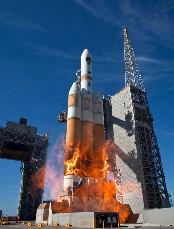 The triple-wide Heavy launcher is the most powerful rocket available in the U.S. inventory, capable of putting school bus-sized reconnaissance observatories into polar orbit.
