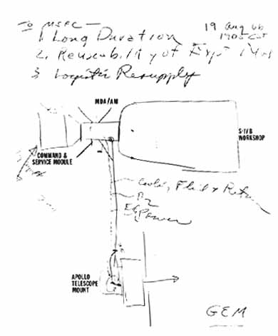 A sketch by Associate Administrator for Manned Space Flight George E Mueller indicates his thinking on the configuration of the S-IVB workshop in August 1966.