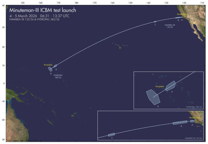 Navigational Warnings have appeared that point to the test #launch of an unarmed #Minuteman-III #ICBM from Vandenberg to the Ronald Reagan test range in Kwajalein, March 4-5.