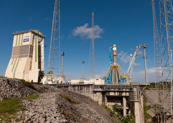 Photo highlight: #Soyuz is shown suspended over its launch pad after being raised to the vertical position #VS08 pic.twitter.com/T0o9fc4lIa