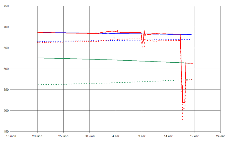 2. 10 августа отмечено небольшое, но устойчивое изменение орбиты объекта B. В тех попугаях, в которых можно быстро посчитать с помощью Excel'а -- с 98.055°, 667.7x672.3 км, до 98.058°, 668.0x672.0 км.