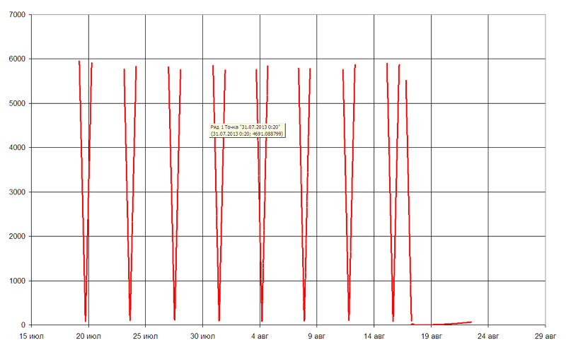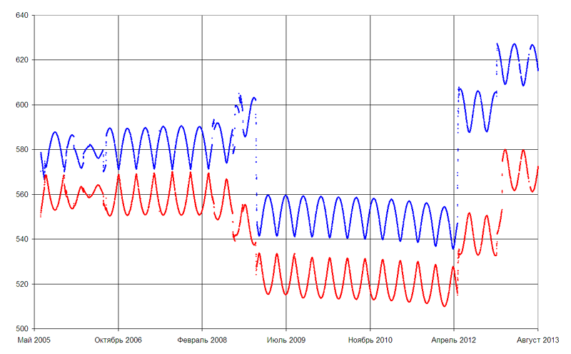 Теперь аналогичный график для расстояния между 39210 и спутником SJ-7 2005 года запуска: