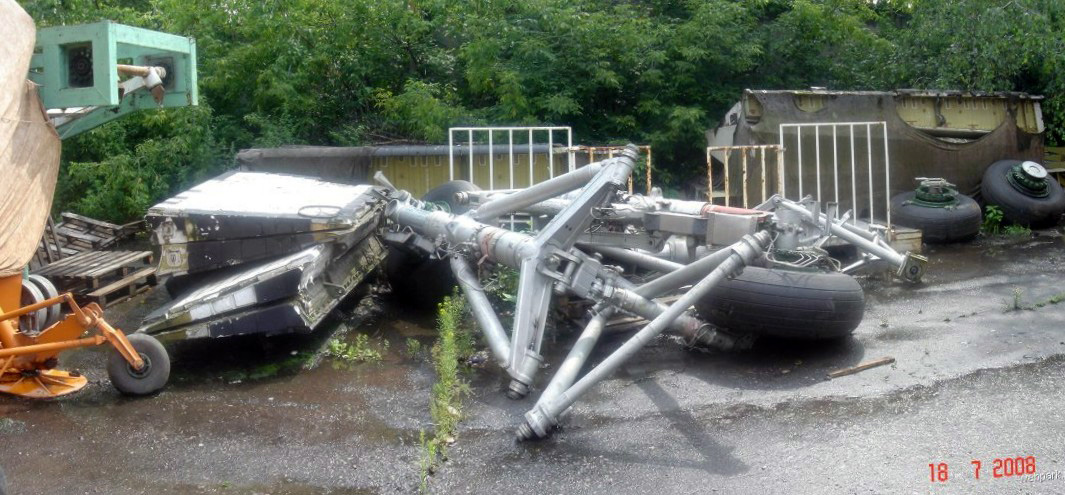 И у меня была надежда, что в ЦПКиО, на левой консоли, которая была полностью комплектной, стоит и комплектная стойка шасси. Так оно и есть, но тяга отсутствует напрочь, а гидравлика порезана, искорежена, завернута в узлы, и разорвана (трассы расплетены на отдельные патрубки и брошены).