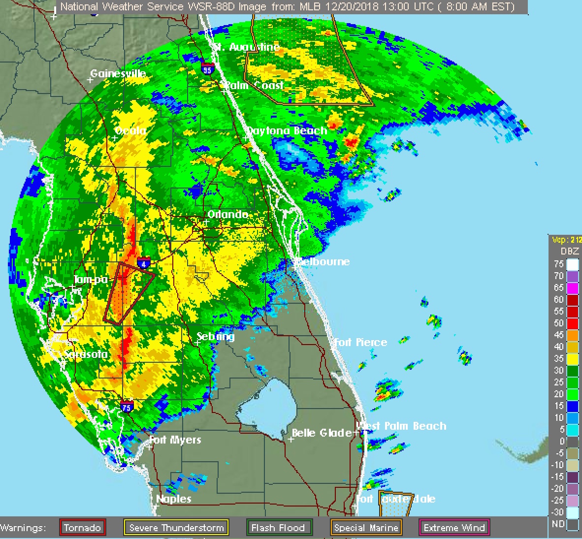 Here's a view of the National Weather Service radar a few minutes ago, showing thunderstorms and rain showers approaching Florida's Space Coast from the west.