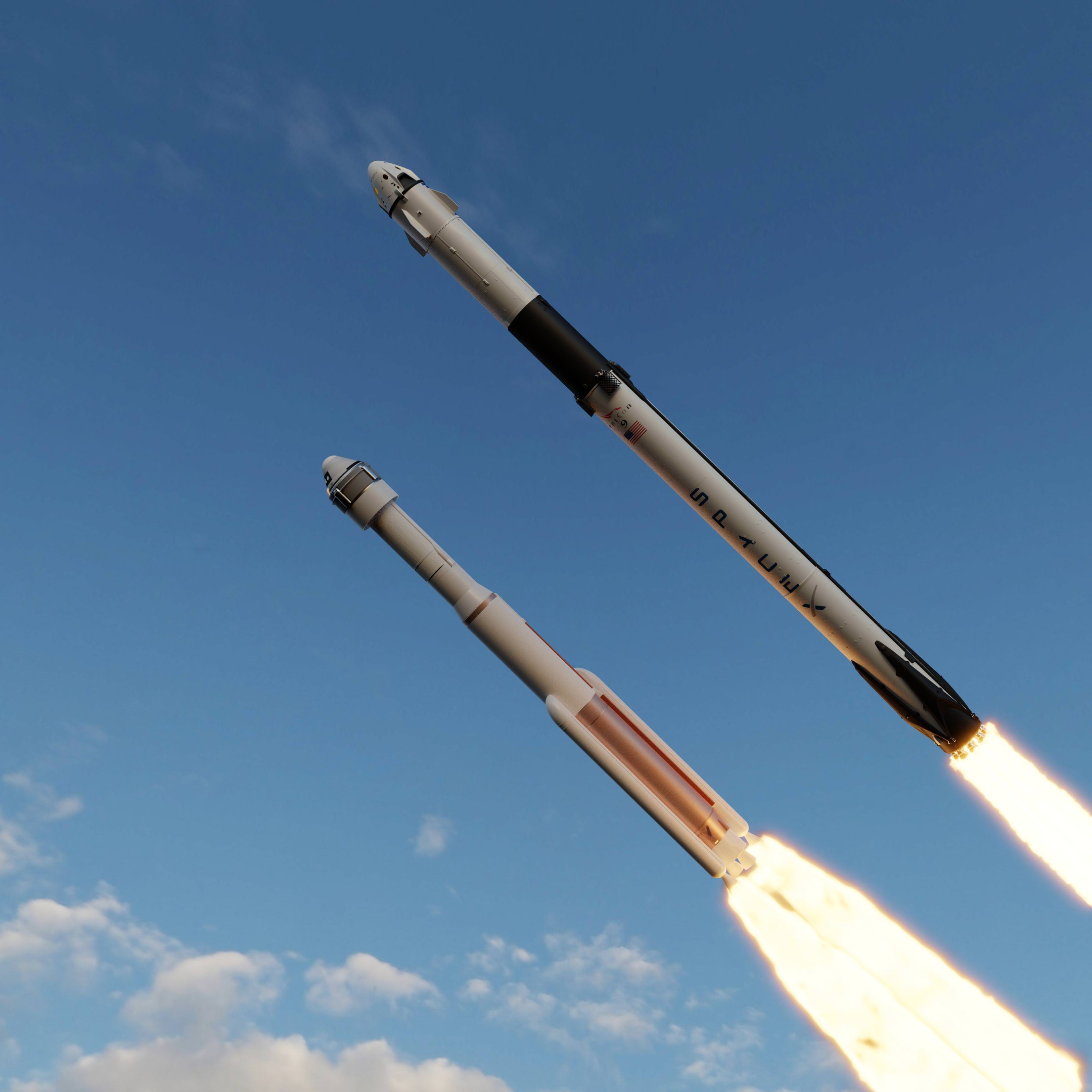 Ракета несёт космический корабль Dragon 2 (Dragon Crew) и летит рядом с ракетой Atlas V с космическим кораблём Starliner на борту.