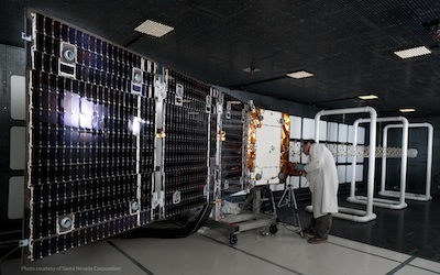 A second-generation Orbcomm satellite under construction at the Sierra Nevada factory in Colorado. Photo credit: Sierra Nevada Corp.