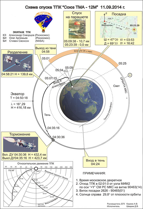 ЦитироватьВ соответствии с программой полёта Международной космической станции 11 сентября 2014 годазапланировано приземление спускаемого аппарата «Союз ТМА-12М» с экипажем 39/40-й длительной экспедиции на МКС в составе космонавтов Роскосмоса Александра Скворцова, Олега Артемьева и астронавта НАСА Стивена Свонсона.