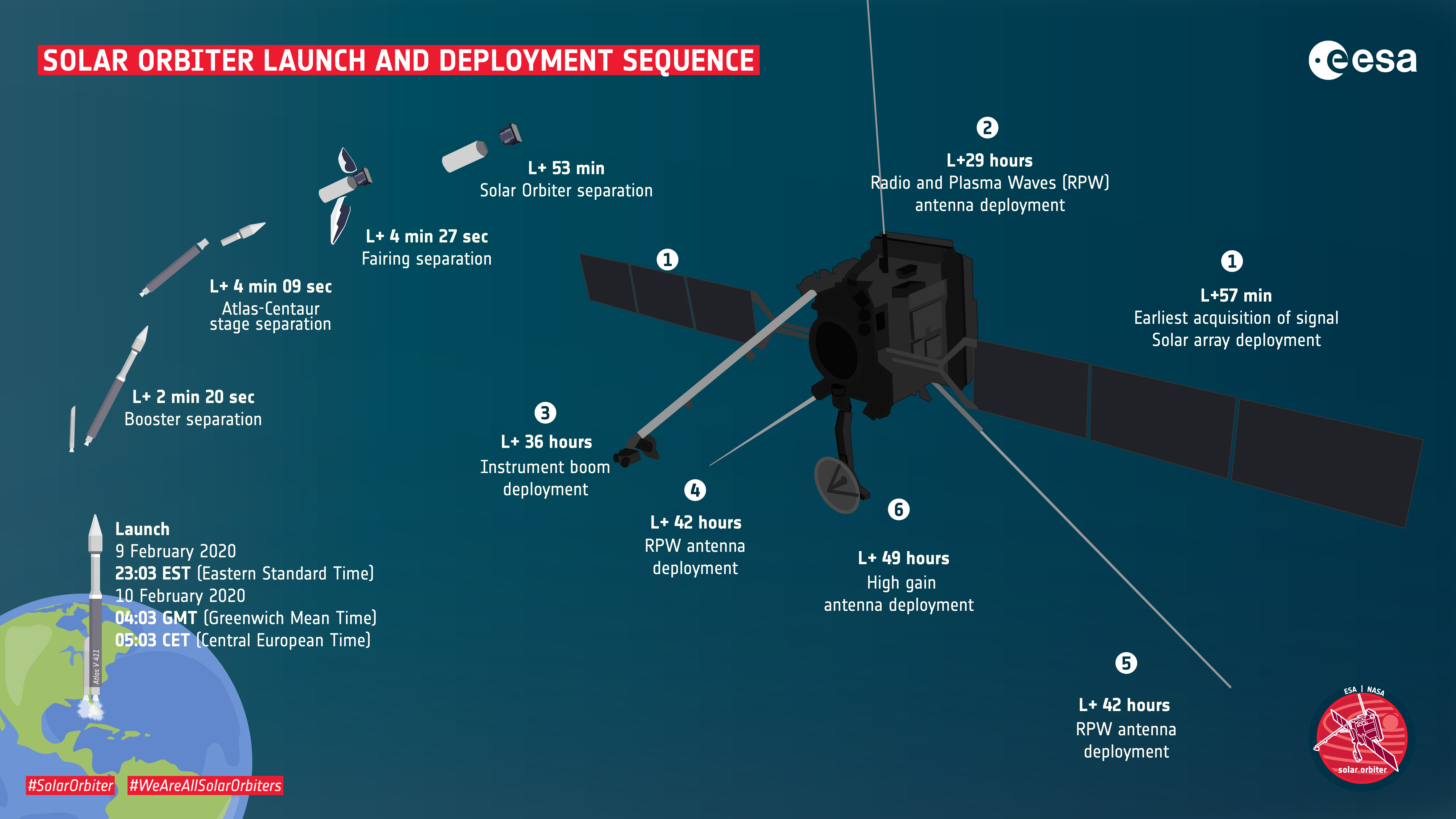 This illustration explains the process to launch and deploy Solar Orbiter beginning with liftoff at 11:03 p.m. EST (0403 UTC) tonight.