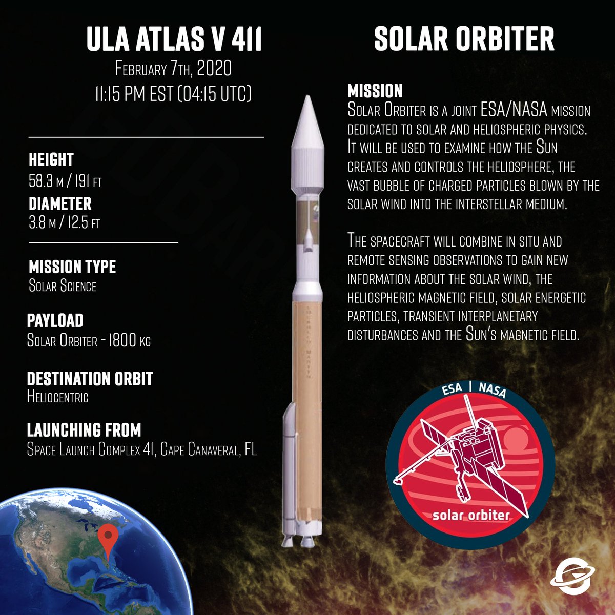 NASA, ESA (European Space Agency), Airbus and United Launch Alliance now are targeting 11:03 p.m. EST Sunday, Feb. 9, for the launch of the Solar Orbiter mission on an Atlas V rocket from Space Launch Complex 41 on Cape Canaveral Air Force Station in Florida. The launch has a two-hour window.