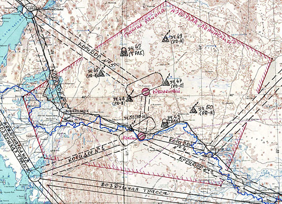 с указанием всех воздушных коридоров и некоторых элементов радиотехнической системы автоматической посадки "Вымпел".