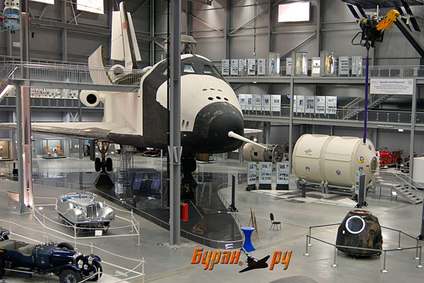 Общая панорама космической экспозиции (наглядно видно  соотношение размеров "Бурана" и возвращаемой части "Союза" как красноречивое свидетельство наших утраченных и оставшихся возможностей в освоении космоса):