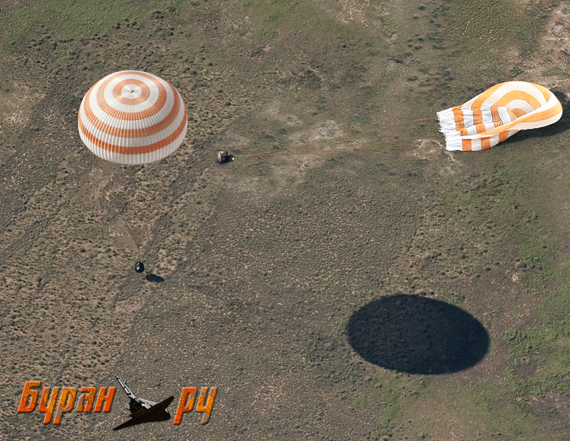 Итак, самый интересный и наименее показываемый момент - срабатывание двигателей мягкой посадки спускаемого аппарата "Союза" во всей красе: