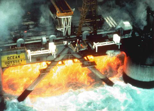 Вот что я для себя узнал: она была построена в Японии в 1982-84 годах и спущена на воду под именем Ocean Ranger II. Однако после того, как однотипная платформа Ocean Ranger перевернулась во время шторма, Ocean Ranger II был переименован в Ocean Odyssey. Это был "первый звонок", но ему не придали значения. В процессе эксплуатации на Ocean Odyssey случился сильный пожар, один из самых крупных за всю истории пожаров на плавучих платформах
