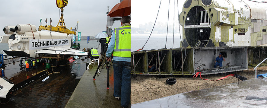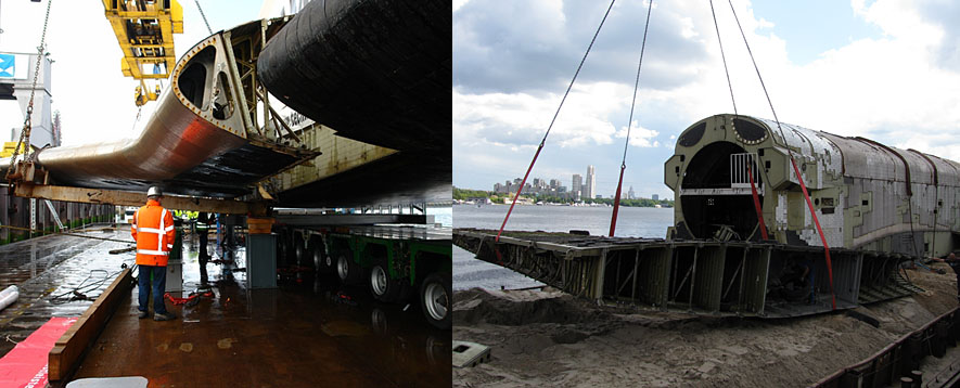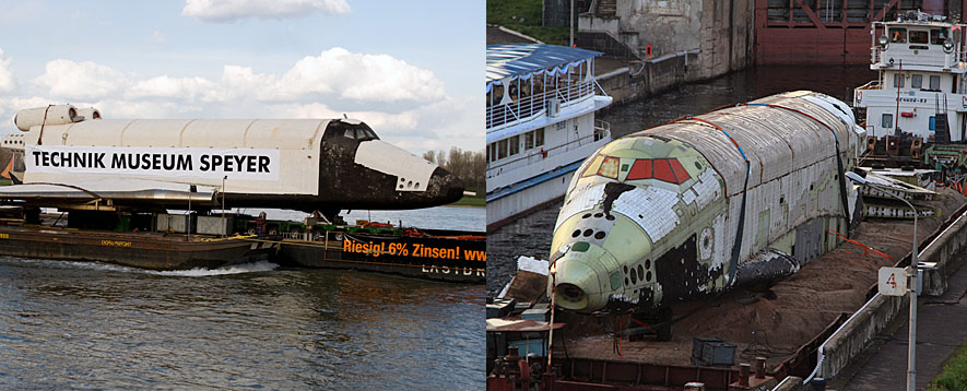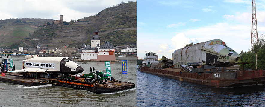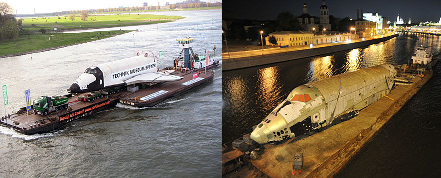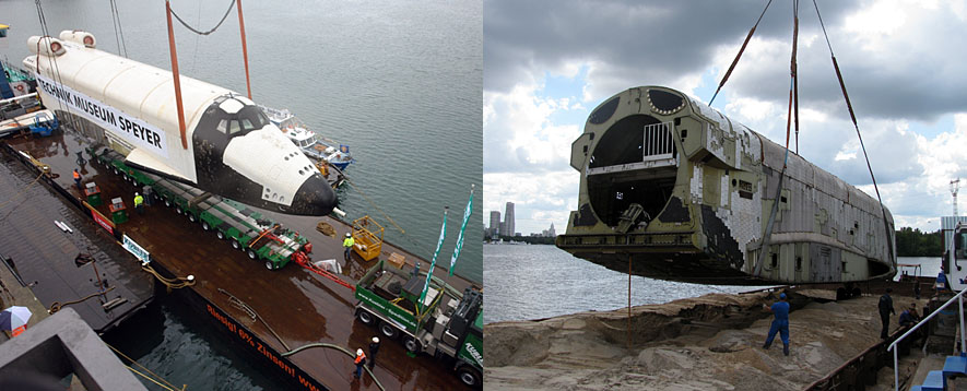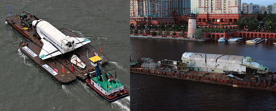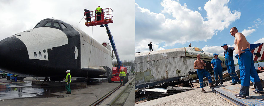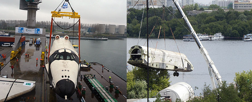 Схема транспортировки "Бурана" с берегов Химкинского водохранилища на аэродром была детально отработана ещё в 1980-е годы. Даже построенные для этого пристани в Тушине и в Жуковском сохранились по сей день. Но уникальная баржа, переправлявшая космический челнок по Москве-реке, давно находится в музее в Германии вместе с одним из Буранов. А специально разработанные подъёмные устройства ещё в 1990-х утрачены вместе с чертежами. Пришлось использовать обычную баржу и современный 300-тонный кран.