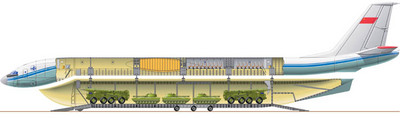 Был и еще один заказчик на воздушных гигантов – военные. В конце 1970-х в СССР вовсю велись работы по созданию уникальной космической системы, предусматривающей воздушный старт космического аппарата с гигантского самолета-носителя. Первым промежуточным вариантом такого самолета стала «Мрия» – большегрузная модификация Ан-124 «Руслан», у которого удлинили фюзеляж, добавили секцию в крыло, прикрепили к ней по дополнительному двигателю и увеличили количество стоек в шасси. А экспериментальному машиностроительному заводу (ЭМЗ) им. Мясищева была поручена разработка принципиально нового большегрузного самолета – М-52.