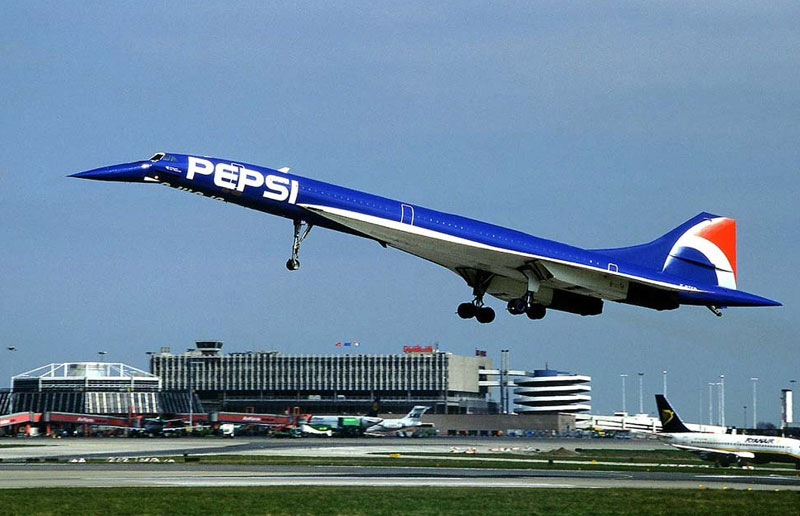 После отказа НПО «Молния» компания Pepsi Cola остановилась на англо-французском сверхзвуковом пассажирском самолете Concorde. После обращения к двум авиакомпаниям, эксплуатировавшим «Конкорды» (Air France и British Airways), положительный ответ дали французы. С ними был заключен соответствующий контракт, условия которого не раскрыты до сих пор. По требованиям контракта, самолет нужно было перекрасить в синий цвет, но белая окраска «Конкордов» диктовалась температурным режимом на сверхзвуке. В итоге было решено покрасить в синий цвет только фюзеляж, оставив крылья белыми для сохранения заданной температуры в топливных баках. При этом было введено ограничение на скорость полета: на М<1.7 время полета не ограничивалось, а на своей крейсерской скорости М=2.02 самолет мог лететь не более 20 минут. В связи с этим выбранный для перекраски самолет Concorde 101 c бортовым № F-BTSD (серийный №205), получивший неофициальное имя «Голубой Конкорд», был выведен из плановой эксплуатации. На перекраску самолета, начавшую в обстановке строгой секретности (компания Pepsi Cola рассчитывала на шоковый эффект своей акции) в марте 1996 г., потребовалось 200 литров краски и 2000 часов рабочего времени. Самолет был представлен публике 2 апреля 1996 г. в лондонском аэропорту Гатвик (Gatwick). На открытии шоу присутствовали мировые знаменитости Клаудиа Шиффер, Андре Агасси, Синди Кроуфорд и сотни приглашенных журналистов. После этого в рамках рекламной кампании Pepsi самолет совершил 16 полетов, посетив Париж, Дублин, Стокгольм, Бейрут, Дубай, Каир, Милан и Мадрид.