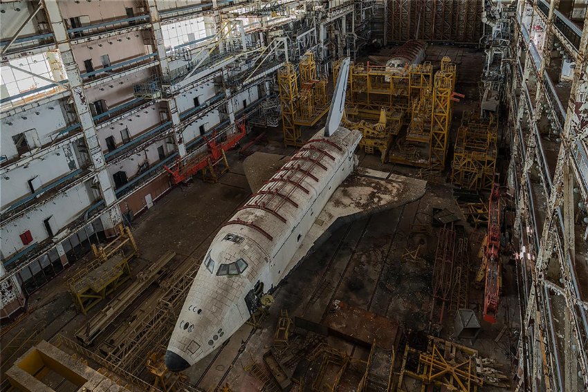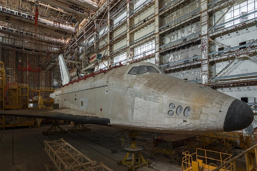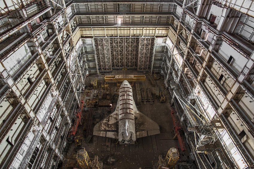 На первый взгляд, очертания этой развалины напоминают американский спейс шаттл, и сходство это неслучайно. Ведь здесь хранится наследие другой стороны конфликта времен холодной войны: космический корабль «Буран» 1.02 и его прототип ОК-МТ, прозванный «птичкой». Они представляют собой остатки необычайно дорогостоящей программы космических полетов распавшегося Советского Союза.