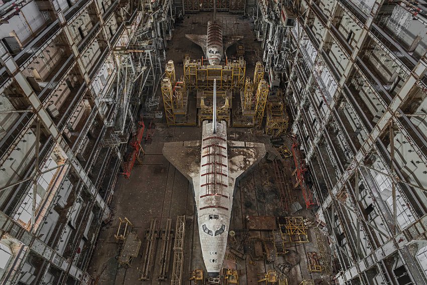 Он карабкался наверх по разрушенным лестницам и платформам, чтобы запечатлеть сконструированный в 1980-х годах космический корабль с высоты птичьего полета. Это было не так уж безопасно: однотипный корабль Буран 1.01, хранившийся поблизости в похожем ангаре, развалился в 2002 году под обрушением крыши помещения. Он был единственным из «Буранов», совершившим полет в космос — хоть это был всего лишь тестовый полет без экипажа на борту в ноябре 1988 года.