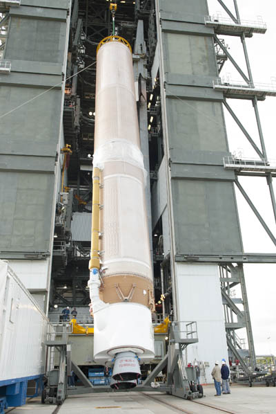 Next week will be spent attaching the solid-propellant boosters. The Centaur and its RL10 cryogenic engine will be installed the following week.