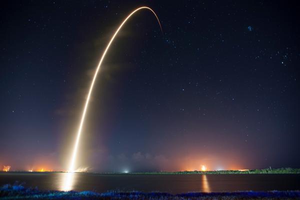 T+plus 20 seconds. The Falcon 9 rocket's pitch program has initiated to put the 208-foot-tall rocket on an northeasterly trajectory from Cape Canaveral.