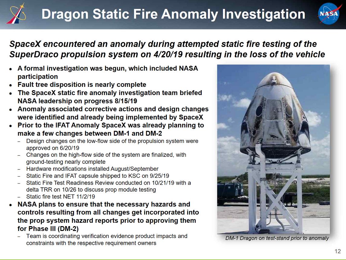 Latest update on the investigation into the static-fire anomaly that destroyed the Crew Dragon capsule in April. Static fire test with new Dragon now planned for next week; if successful, do in-flight abort test in early December.