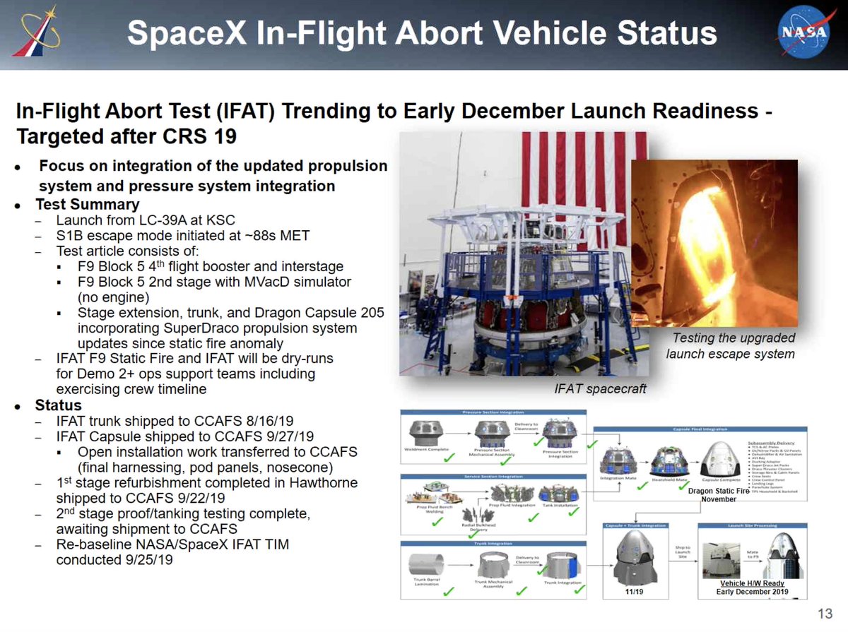 NASA's Kathy Lueders: Crew Dragon in-flight abort test expected in early December, assuming a good abort hotfire test set for the middle of next week. Before IFA, SpaceX will refurbish Crew Dragon & replace burst disks in prop system (newly added to replace faulty check valve).