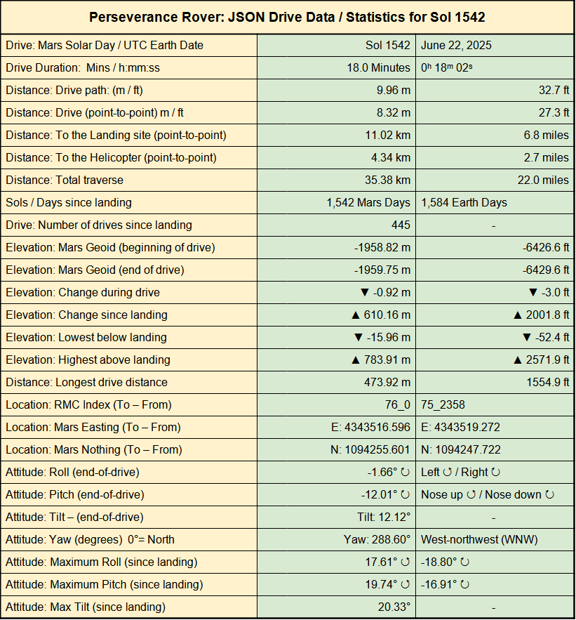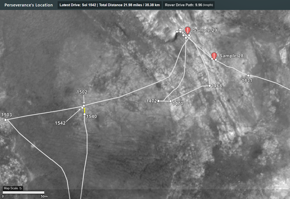Марсоход Perseverance совершил короткую поездку на север на sol 1542, вернувшись в более раннее место, где он останавливался  на ночь на sol 1502