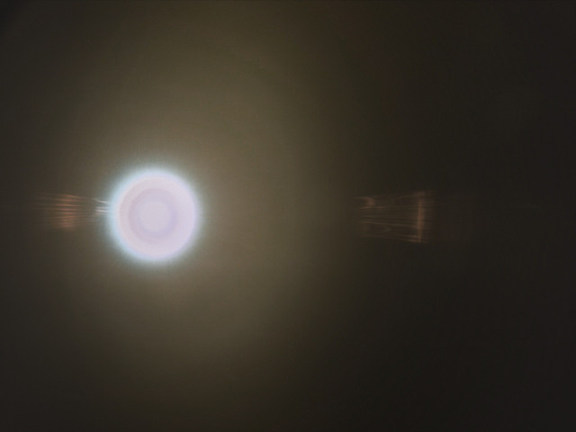 На верхней картинке похоже на то, что у Гилла, но у него свечение все-таки идет по линии, без верхней части ( он обрабатывает снимки, возможно убрал верхнюю часть в порыве творчества).  Шут его знает, но напоминает те блики которые у вас парят в воздухе.
