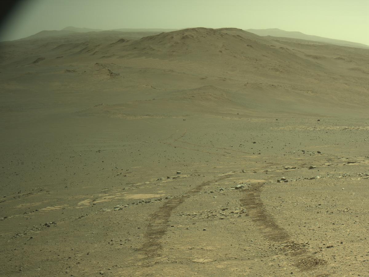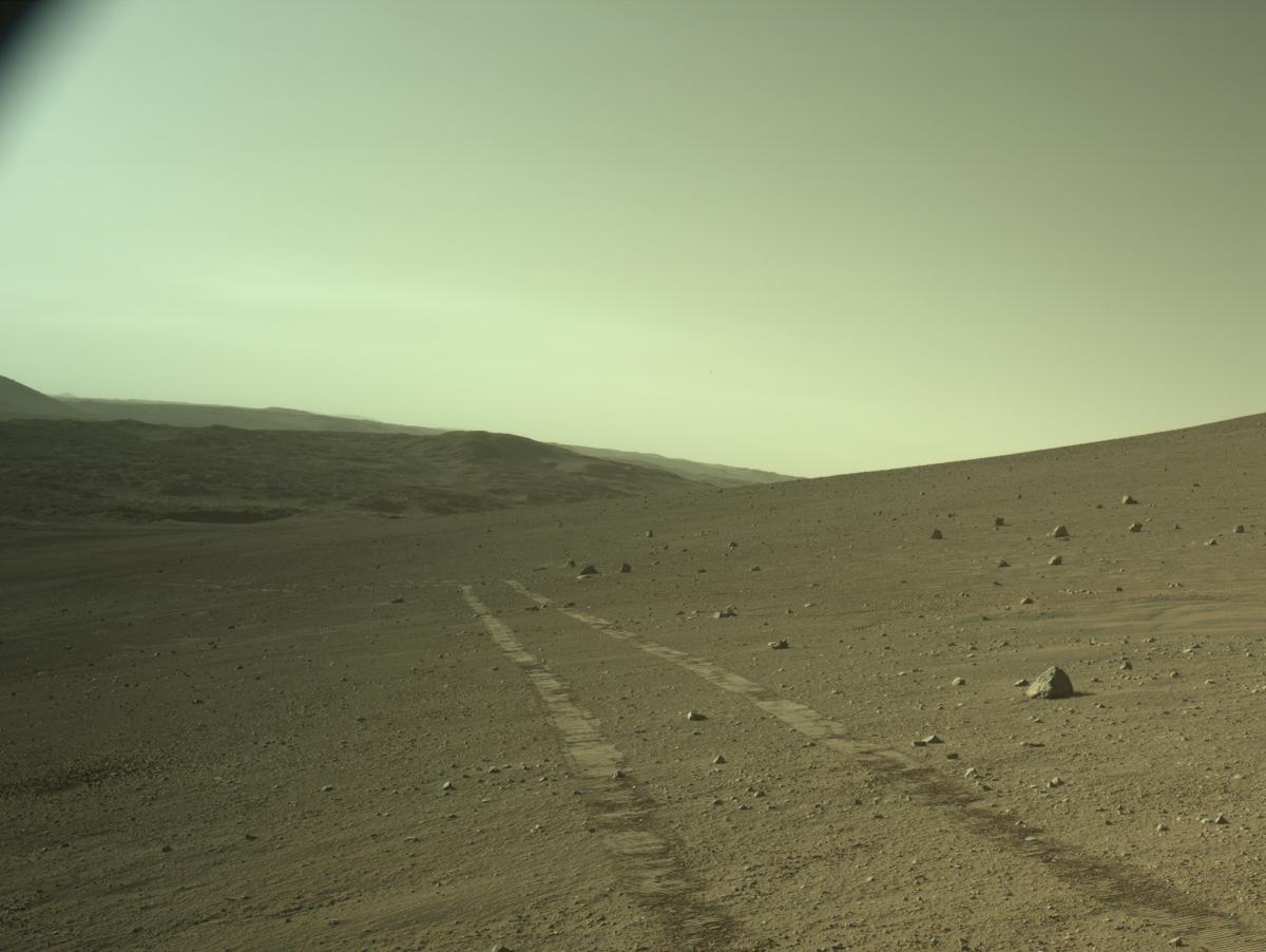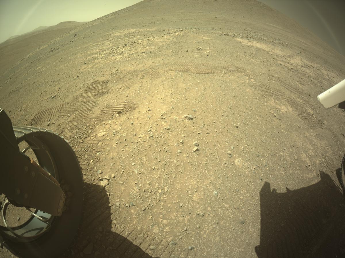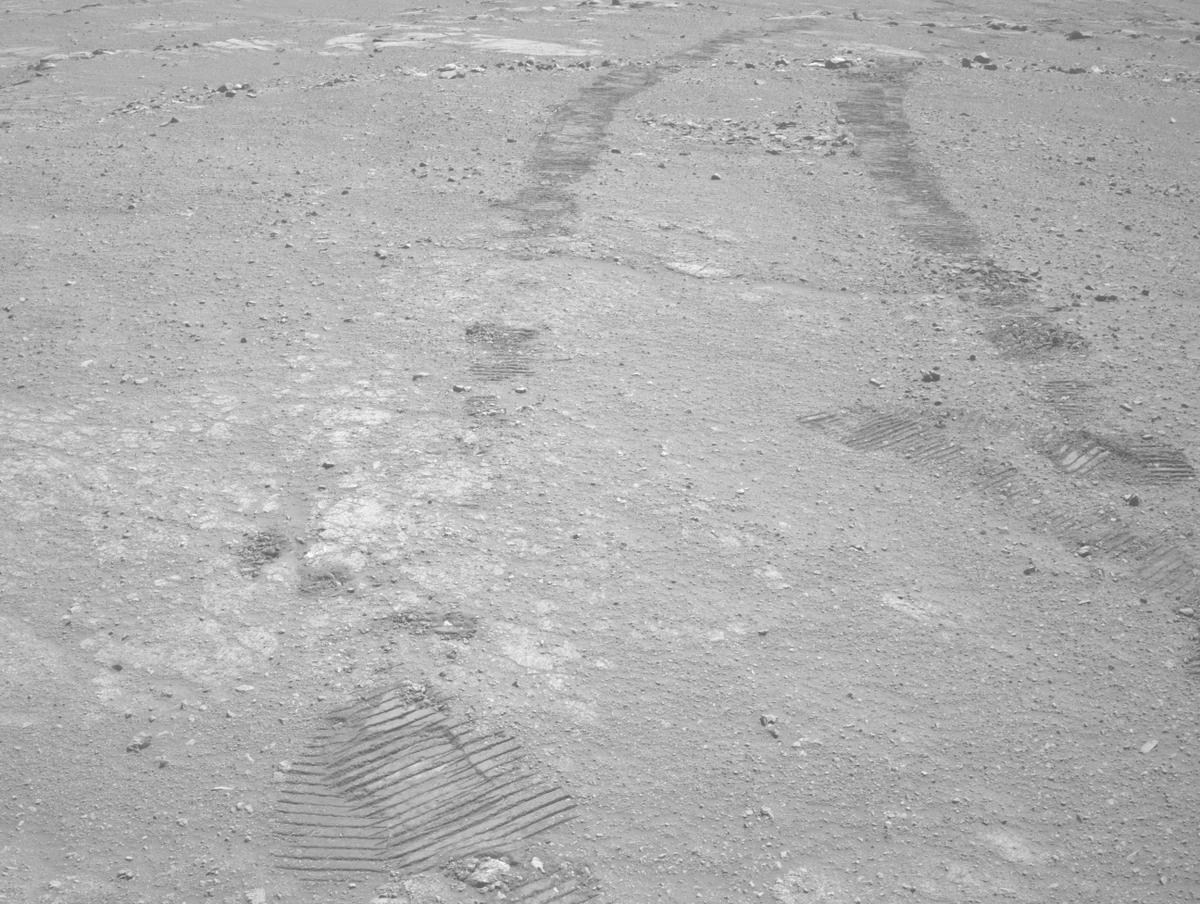 По следам оставленным марсоходом и снятым задней левой камерой по предотвращению опасностей  видно, что Perseverance развернулся.