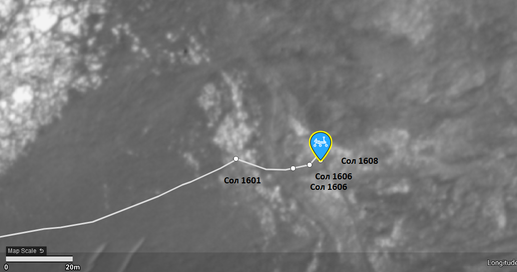 На некоторых браузерах появилась обновленная таблица JSON и обновленная карта NASA/JPL M20 за 28  августа (1608 сол). Как и предполагалось, ровер совершил небольшой трек, проехав "dist_m": 6.624 и в конце развернулся, сейчас он здесь: