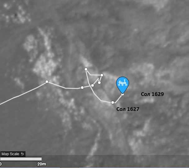 Отредактировал. Ровер 17 сентября двигался от точки, где он находился на  Сол 1622 до точки Сол 1627, где находится сейчас. 20 метров по прямой.