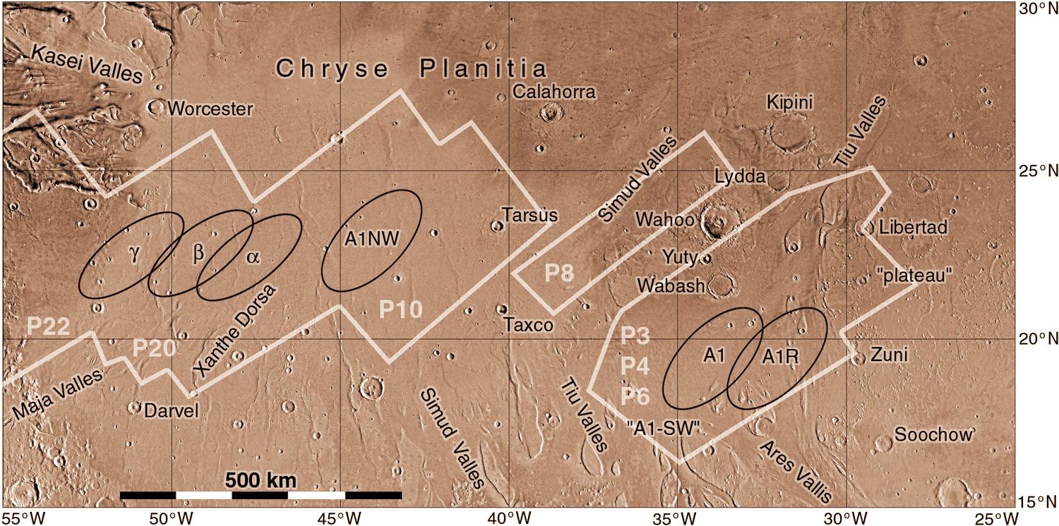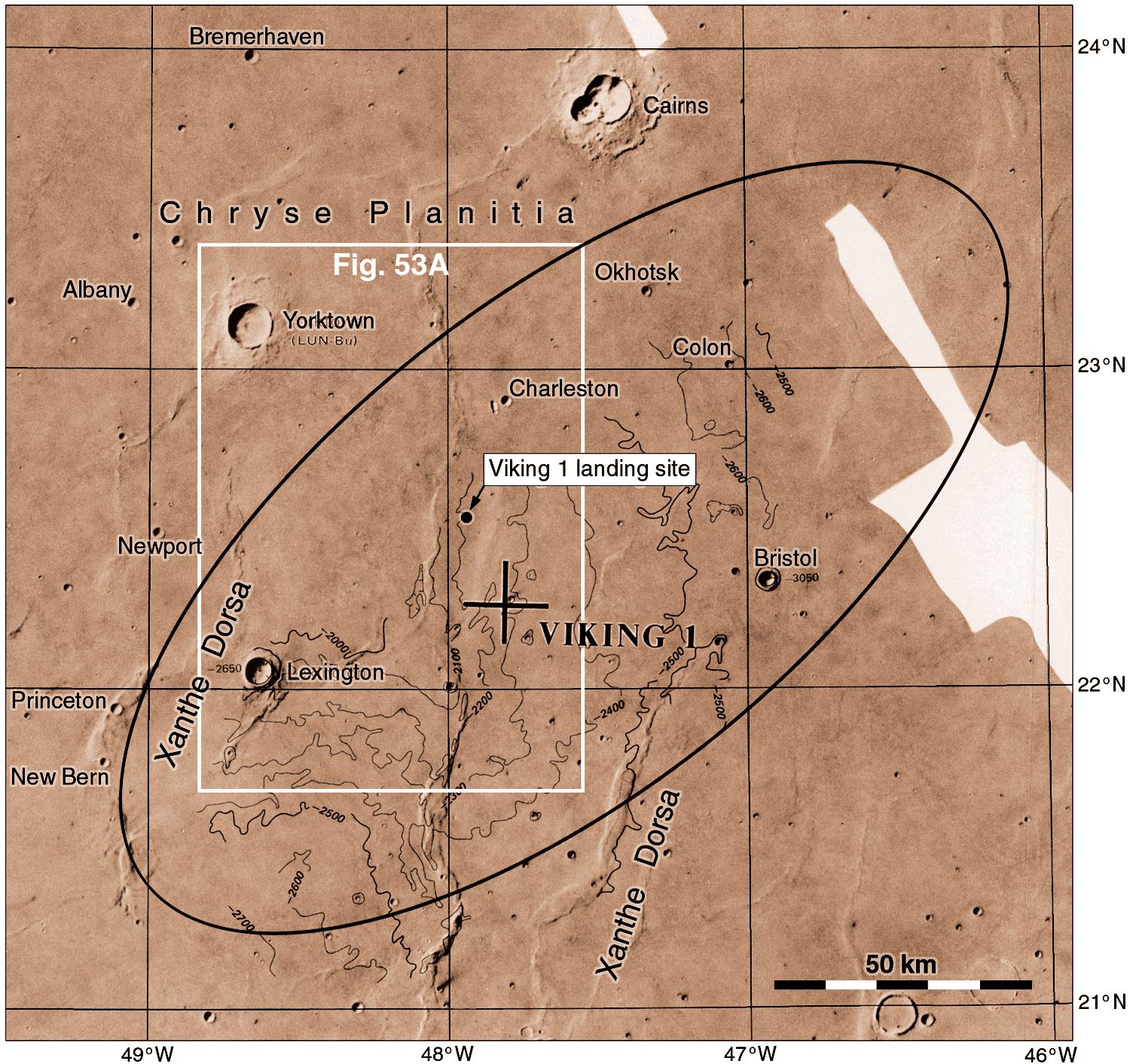 Карта части  Chryse Planitia, на которой показаны изображения, сделанные орбитальным аппаратом "Викинг-1", в виде белых прямоугольников и эллипсов, которые рассматривались для посадочного модуля "Викинг-1". Поиск велся в основном к северо-западу от первоначального местоположения и в конечном итоге привел к довольно удовлетворительному местоположению для миссии. Разрешение в 40 м/пиксель все еще было намного ниже того, которое проектировщики Apollo использовали для оценки безопасности.