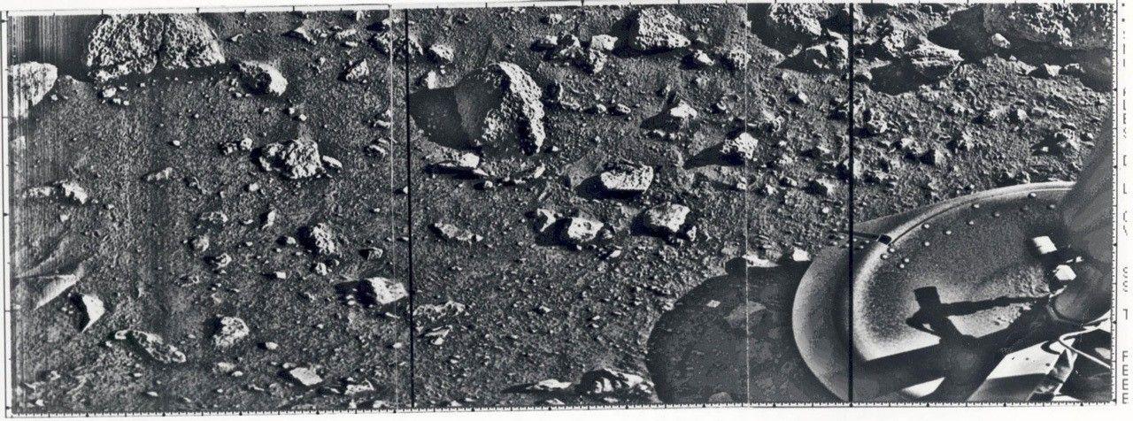 Первое изображение Марса, полученное посадочным модулем Viking 1. На нем видна галька и гравийная поверхность, справа — одна из опор посадочного модуля.