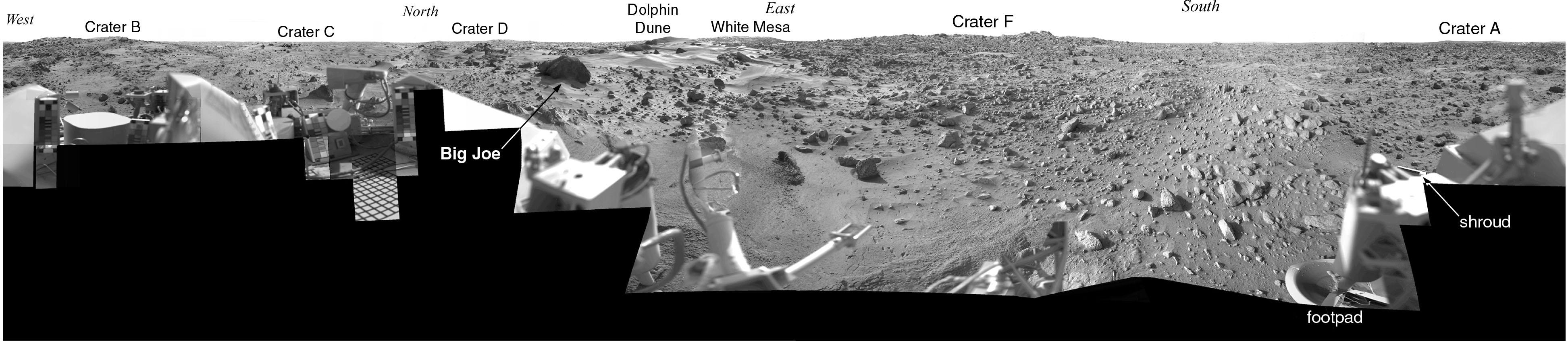 Полная панорама с Викинга-1. На ней видно множество камней, включая один большой валун, а также участок песчаных дюн и небольших холмов (все они — края кратеров) на горизонте.