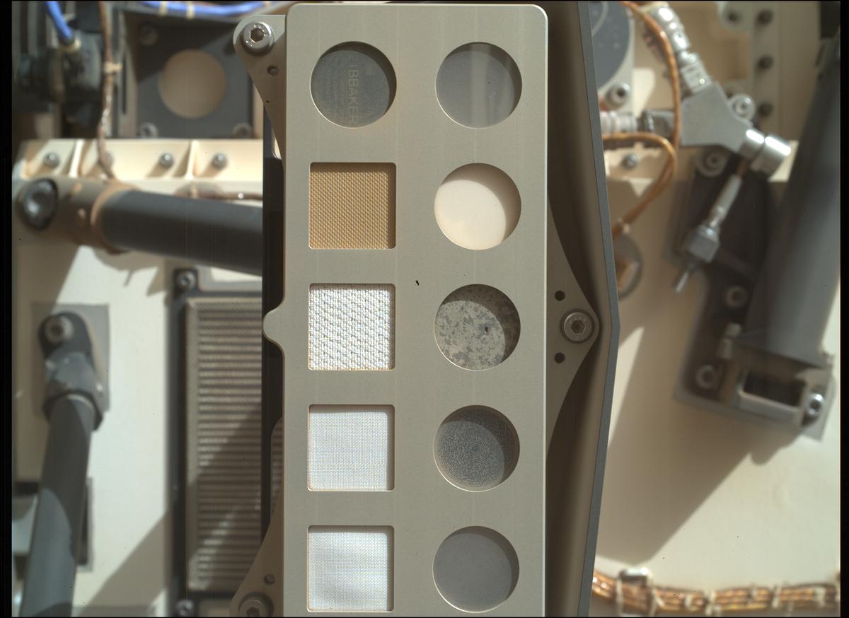 Здесь представлены несколько видов тканей для скафандров, которые изучаются по мере их деградации, на правой вертикальной линии в середине  (с пятнами) находится срез "марсианского метеорита" найденного на Земле и привезенного назад на Марс, ниже среза лабиринт для тестирования интенсивности лазера.