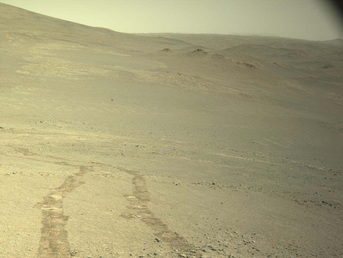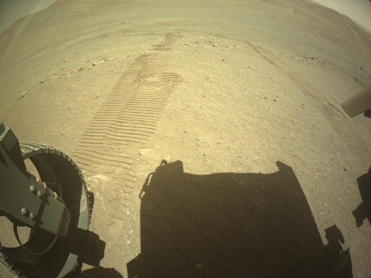 Кажется снимок сделан после того, как ровер развернулся в конце пути, похоже  он двигался к горе/холму, которая теперь оказалась позади Perseverance ?????: