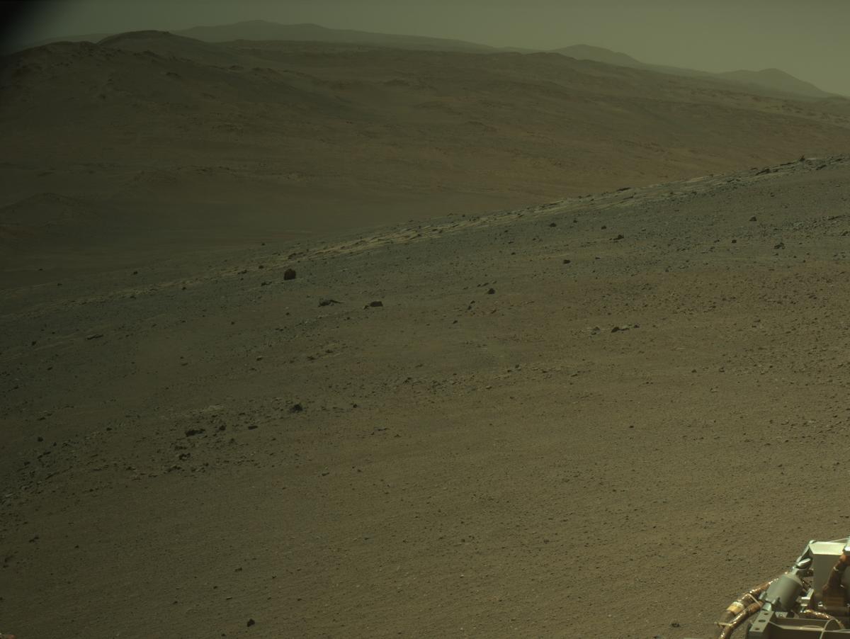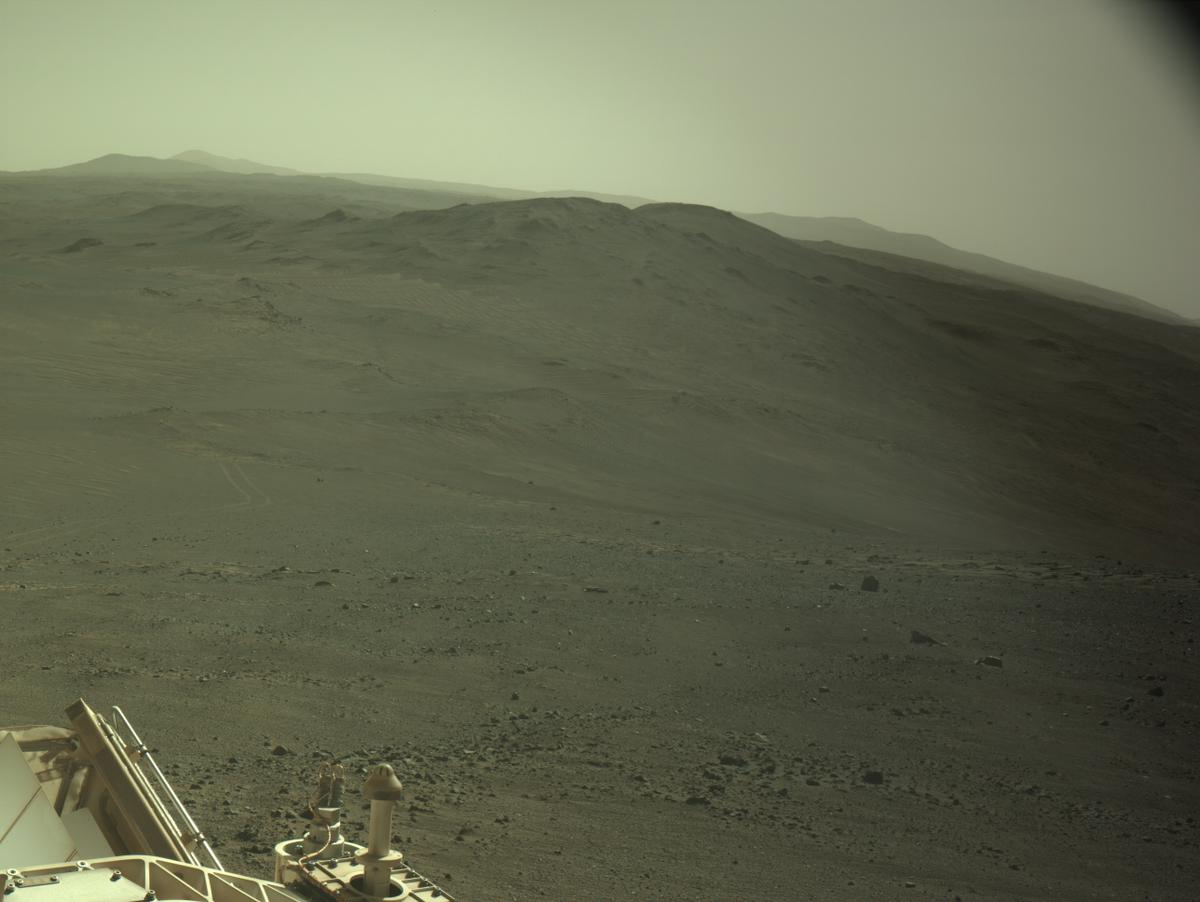 Снято с левой стороны Perseverance. На этом снимке, если приглядеться, видны слева внизу бледные следы марсохода, его путь снизу на возвышенность. Смотрим назад через правую часть кормы. Лучше увеличить снимок по клику.