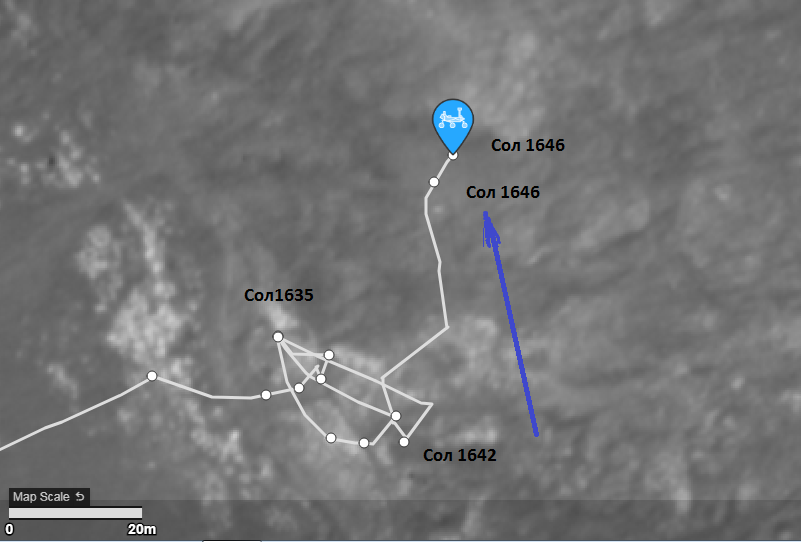 Пришли обновленные данные таблицы JSON на 1646 сол ( 6 октября ). Ровер проехал "dist_m": 52.8 и сделал во время движения одну остановку, теперь марсоход здесь: