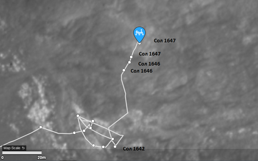 Пришли данные по небольшому пробегу 8 октября 2025 (сол 1647). Согласно таблице JSON марсоход в этот день проехал  "dist_m": 17.102 , при этом сделал одну остановку (первая отметка Сол 1647) и развернулся в конце пути. Сегодня, 9 октября (Сол 1648), он здесь: