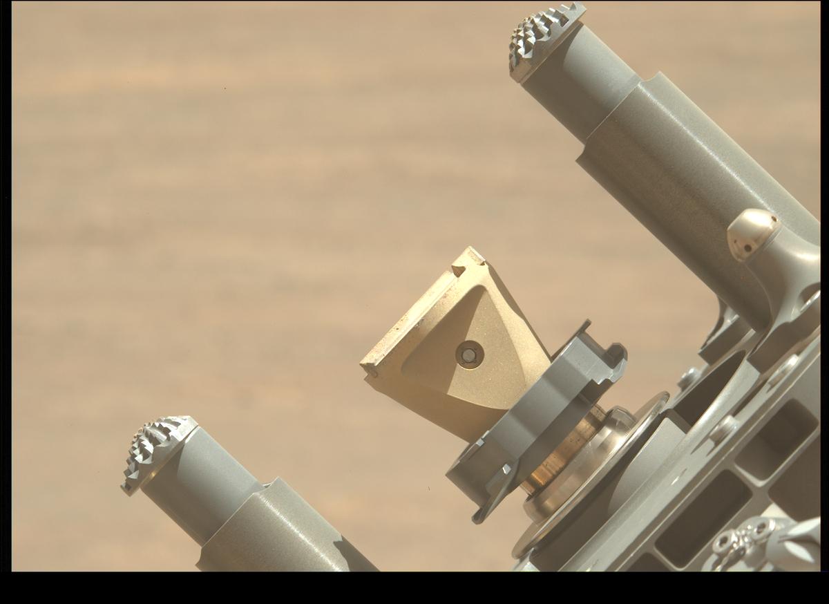 Вчера, 6 октября на 1646 сол, ровер изучал привезенные с собой мишени для калибровки спектрометра SHERLOC  (См. выше на странице) (Сканирование обитаемых сред с помощью рамановской спектроскопии и люминесценции для обнаружения органических веществ и химикатов), но калибровал при этом прибор/инструмент PIXL  (Планетарный прибор для рентгеновской литохимии  PIXL. PIXL оснащен рентгеновским спектрометром) на мишенях с материалами для скафандров и в частности  на мишени 221BBAKER (адрес Шерлока Холмса) произведенной из поликарбоната для визора шлема скафандра. Возможно  PIXL изучал состояние материалов скафандров и визора. Вот так он это делал: