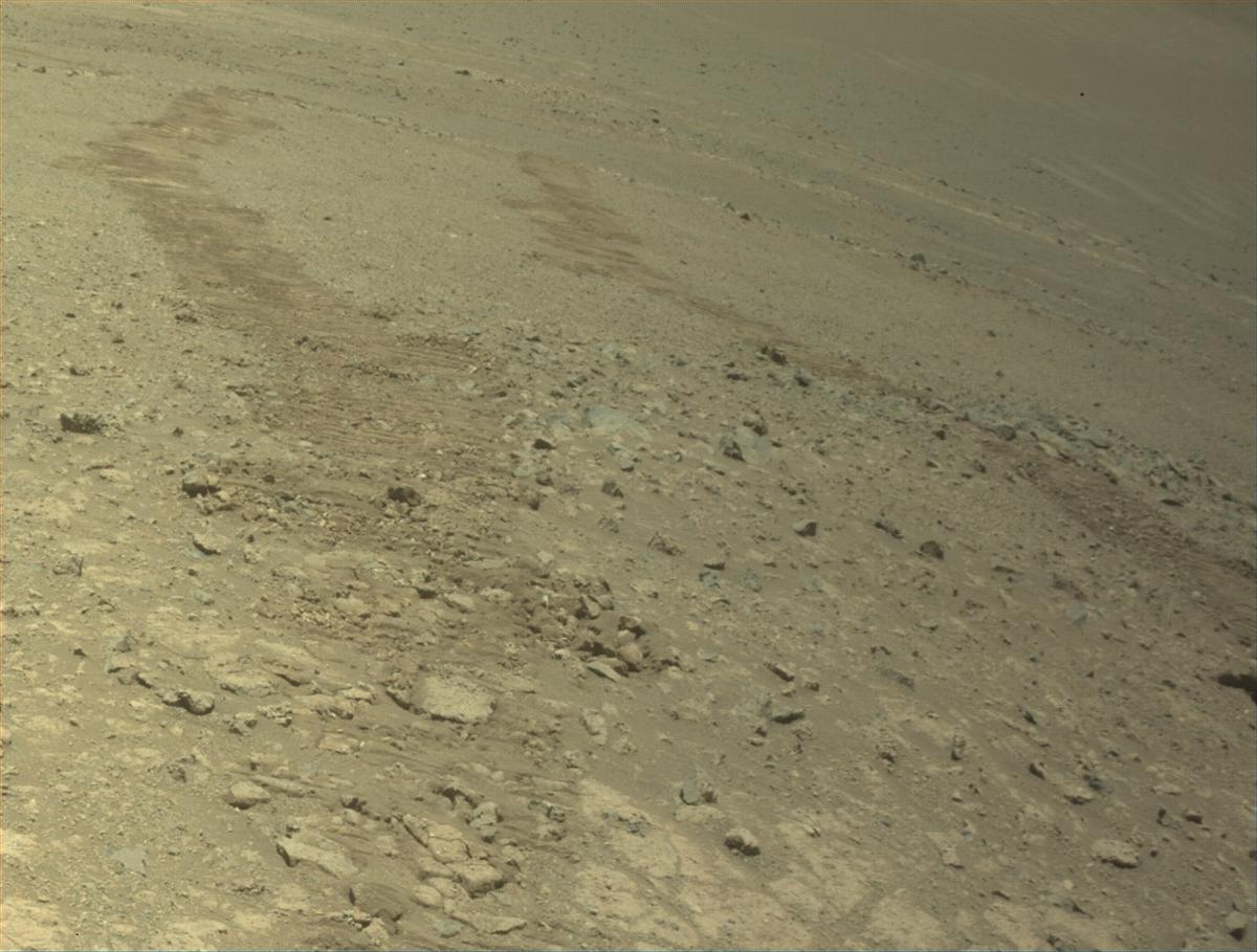 Сегодня, 13 октября 2025 (сол 1652) ровер никуда не двигался и кроме съемки своей аппаратуры снова снял следы оставленные 8 октября (сол 1647) в рыхлом грунте. Правда теперь он снимал другой камерой, передней левой камерой по предотвращению опасностей А (раньше он снял следы одной из навигационных камер (Navcam) с вышки.)