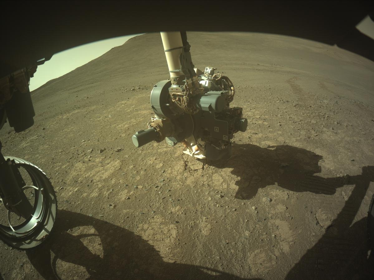 Марсоход NASA Perseverance получил это изображение с помощью камеры SHERLOC WATSON, расположенной на башне на конце роботизированной руки марсохода.