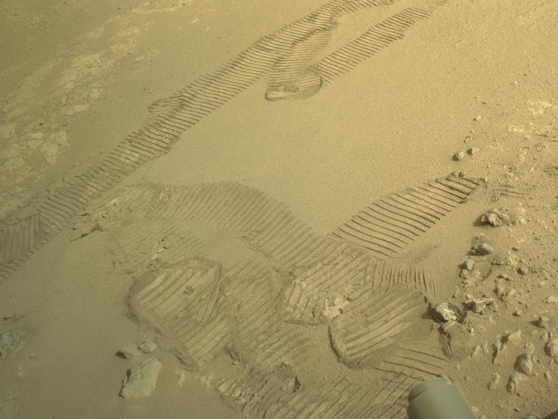 The rover tracks seen in the video are from Perseverance's two previous southbound traverses on May 18 and 19, 2025 (sols 1,509 and 1,510).