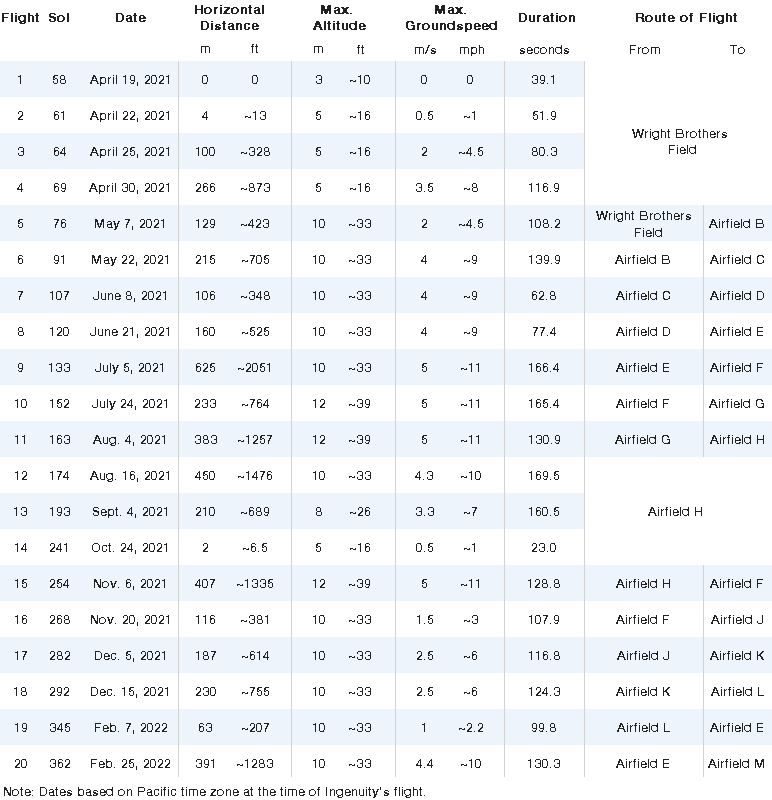 ЖУРНАЛ ПОЛЁТОВ «Ingenuity» ПО СОСТОЯНИЮ НА 3 МАРТА 2022 (20 рейсов)