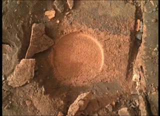 В том месте, где ровер с помощью плоского сверла делал абразивное пятно и оперся на обрабатываемый камень  прижимными держателями (штифтами), произошло проседание породы  и фрагментация, как пишет  наблюдатель